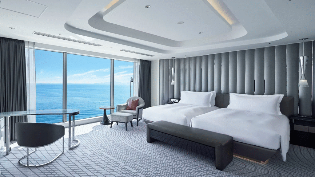 海の景色に癒やされました。部屋から一面のオーシャンビューはいいですね。心を落ち着かせる時間を作るのは大事だなと思いました。